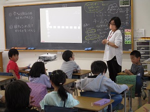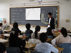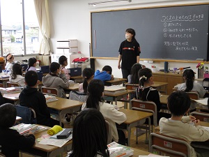 今週の月曜日から、栄養教諭になるために教育実習の先生が4年1組に来ています。栄養教諭の教育実習は、1週間だけなので、今日が最終日になります。3時間目には、4年1組で栄養指導の研究授業が行われました。「バランスのよい朝ご飯を考えよう」という学習です。主食、主菜、副菜、汁物・飲み物の4つを入れて、バランスのよい献立を考えたり、朝ご飯を毎日しっかり食べるよさを考えたりと、楽しく学習することができました。教育実習で学んだことを生かし、すてきな先生になってほしいと思います。
