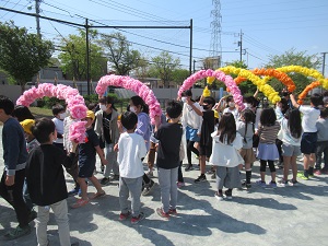 昨日は、出張に出かけたため、更新が1日遅れになってしまいました。昨日は、1年生の校庭デビューの日、「にこにこの道」が行われました。2~5年生が列になって作った道を1年生が6年生と手をつないで通っていくという微笑ましい行事です。1年生は、嬉しそうだったり、恥ずかしそうだったりと、いろいろな表情を見せていました。入場の後は、上級生からの歓迎の言葉、1年生からのお礼の言葉、校長先生からのお話と続きました。その後、ずっと校舎内で過ごしていたためか、元気に校庭で遊ぶ1年生の姿が見られました。ジャングルシムや雲梯が人気、6年生と鬼ごっこをして遊ぶ子もいましたよ。