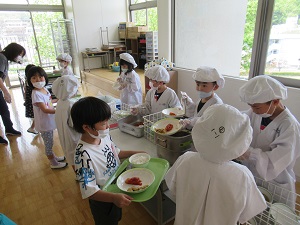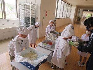 1年生初めての給食です。あいにく私が出張で給食が始まってから学校に戻ってきたため、写真は撮れないかなと諦めていたのですが、校長先生が写真を撮ってくれていました。1年生の子供たちは、白衣を着ること、こぼさないように運ぶこと、みんな同じ量を配ること、牛乳のキャップを運ぶこと…、一つ一つが初めてでした。よくがんばって配膳できたようです。少しずつ慣れてくれればいいですね。初めての給食の味はどうだったでしょうか。直接感想を聞けなかったので、ぜひご家庭で聞いてみてください。