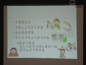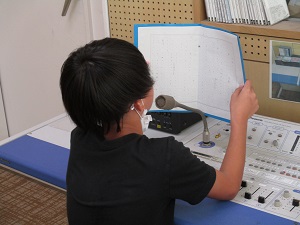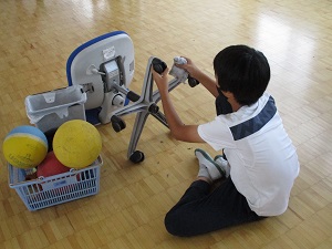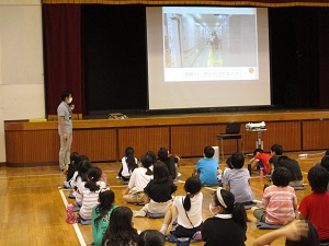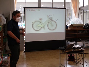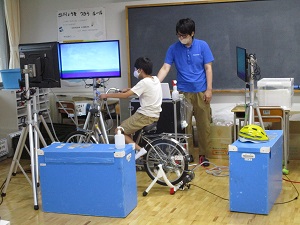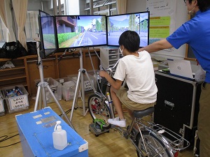 にじ組の3年生と5年生が、自転車シミュレーター交通安全教室を行いました。自転車シミュレーターは、写真のようにテレビ画面に仮想の道路をが映し出され、画面の前にある自転車をこぐと、それに合わせて画像も動くというもので、ちょうど自動車教習所のシミュレーターと同じようなものです。自転車の事故はなかなか減らないのが現状です。このシミュレーターを通して、実際には体験できない危険を知り、自転車の乗り方を気を付けてほしいと思います。機材の関係で、少人数しか実施できないため、にじ組さんを対象としています。