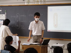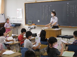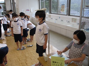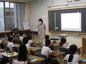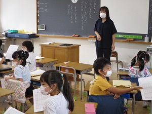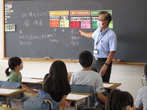 今日で8月も終わります。今年の夏も暑くなりました。今日は久しぶりに30℃を超え、まだまだ残暑が厳しいようです。熱中症には十分に気を付けるよう声をかけていきます。暑い中でも子供たちは元気いっぱい。休み時間には元気に校庭を走り回ったり、大縄跳びをやったりする子供たちでした。また、5年生は、栄養教諭の塩塚先生に食育の授業を行っていただきました。なぜ食べるのか、栄養素のこと、献立などなど、子供たちと対話しながら楽しく進めていました。明日から給食が始まります。好き嫌いなく、がっちり食べるきっかけになればいいですね。