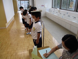 2学期が始まって1週間。月曜日始まりだったため、長く感じた1週間でした。台風が近づいていて雨が多く、すっきりしない天気でした。この土日で疲れをとってほしいと思います。今日から発育測定が始まりました。今日は1年生。身長・体重を測る前に養護の長谷川先生からの保健指導がありました。コロナウィルスを広げないためにという内容の話で、感染を広げないために大切なことを改めて確認しました。さあ、測定です。1年生の子供たちは夏の間にずいぶん大きくなった感じがします。記録されたカードを持ち帰りますので、成長を確かめてください。最後の2枚の写真は、6年生の発電授業の様子です。昨年の6年生もお世話になった小林さん(何と今年度から多摩市教育委員会の教育委員になられました!)に再生可能エネルギーについて教わりました。来週には「えねこや」(再生可能エネルギーだけで生活できる小屋)の体験授業も行います。6年生の総合の学習が着々と進行しています。