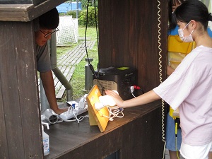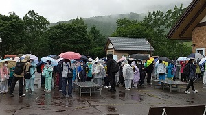 多摩市を出発する時は晴れて暑かったですが、八ヶ岳に向かう途中からくもりそしてポツポツと雨が降って来ました。予定を変更し、まきば公園の牧場を散策しました。小雨なので雄大な景色や草を食む羊や牛たちも見ることができました!集合の仕方も早く立派です。早目に少年自然の家に向かい、そこでお弁当を食べます!「お弁当まだー」子供たちはおなかがペコペコなようです。