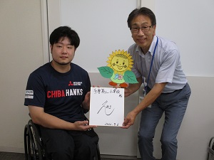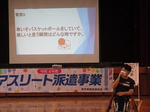 アスリート派遣事業が行われました。東京都の小中学校から50校しか選ばれない事業に、多摩第二小が見事選ばれたのです!今日、お越しいただいたアスリートの方は、川原 凜 選手です。車いすバスケットボール日本代表選手で、東京2020では、銀メダルを獲得しました。また、現日本代表のキャプテンを務めています。4~6年生を対象に行ったトークショーは、子供たちから出された質問に答える形式で行われました。車いすバスケットボールの魅力や練習について、日常生活のことまで、とても詳しく丁寧にお話ししてくださいました。印象的だったのは、日常生活で困っていることはないとのことでした。生まれつき脊髄に病気をもっていたため、小さいころから車いす生活なので、何とも思わないのだそうです。自分自身が普通に考えている当たり前にとらわれてはいけないことを改めて感じました。トークショーの中では、ファシリテーターを務めた醍醐先生と筋肉比べをする場面もありました。(写真がボケてしまいすみません。)モリモリの肩と腕の筋肉に、子供たちからは歓声が上がっていました。模範演技では、車いすの扱いやスピード、シュートのすばらしいこと!それを間近で見られた子供たちは幸せ者です。最後に子供たちへ向けて川原選手からメッセージをいただきました。「自分が好きなことを見つけて、それを楽しみながら努力をしていってほしい。ぜひ、夢中になれるものを見つけてください。」川原選手、ありがとうございました。実技体験は、6年生が行いました。競技用の車いす体験とシュート体験です。思うように動いてくれない車いすに苦戦したり、座ったままだと力が入らずゴールまでボールが届かなかったり、パラスポーツならではの体験ができました。最後に校長室では、銀メダルを間近で見せていただき、色紙をいただき、記念撮影を行いました。(私もツーショット写真をゲットしました!)サイン、分かりますか?「りん」と書かれています!!終わった後、すぐにお車で千葉県までお帰りになった川原選手。帰ってすぐに練習だそうです!本当にありがとうございました。ご活躍をお祈りしております!