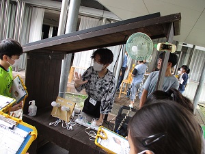 6年生は総合的な学習の時間で、再生可能エネルギーについて学習しています。今日は、昨年度に引き続き「えねこや」が学校にやってきました。「えねこや」とは、エネルギーの小屋です。その名の通り、天井に設置されたソーラーパネルで小屋の中にある電気製品がすべて稼働し、他のエネルギーなしで生活できる小屋です。小屋の中は、冷房も完備されています。あいにくの雨でしたが、子供たちは隅々まで見学していました。また、ソーラーパネルだけで電力を賄えることに驚き、改めて再生可能エネルギーの可能性を知ったようでした。ここで学び、体験したことを整理し、2学期の総合では自分たちで発電することに挑戦します。「えねこや」の皆さん、ありがとうございました!
