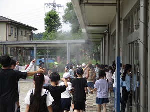 今日はジトっと蒸し暑く、過ごしづらい1日でした。体育や休み時間が終わるごとにミストを出し、少しでも涼む子供たちがいっぱいでした。学校では熱中症にならないために、私が測定したWBGTの数値を、委員会の子供たちが掲示し、注意喚起をしてくれています。こまめな休息、水分補給を行い、安全第一で教育活動を行っていきます。緑の写真は、校長室前にあるゴーヤのグリーンカーテンです。気温が上がり、急に成長が早くなりました。すでに小さい実がついています。夏真っ盛りの時期に大きなゴーヤが実っているのを見るのが楽しみです。