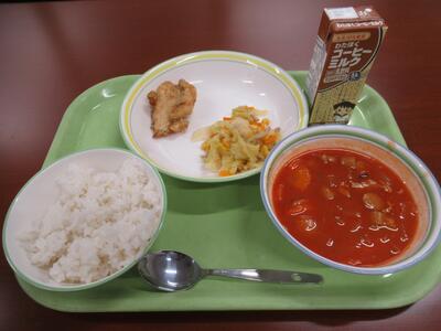 給食 ごはん フェジョアーダ フランゴパッサリーニョ キャベツとコーンのソテー ミルクコーヒー でした。オリンピック・パラリンピック開催国ツアー「ブラジル」の献立でした。