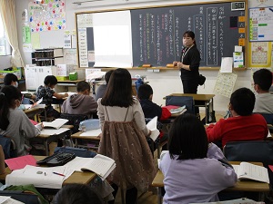 今週の月曜日から、栄養教諭になるために教育実習の先生が4年1組に来ています。栄養教諭の教育実習は、1週間だけなので、今日が最終日になります。3時間目には、4年1組で栄養指導の研究授業が行われました。「バランスのよい朝ご飯を考えよう」という学習です。主食、主菜、副菜、汁物・飲み物の4つを入れて、バランスのよい献立を考えたり、朝ご飯を毎日しっかり食べるよさを考えたりと、楽しく学習することができました。教育実習で学んだことを生かし、すてきな先生になってほしいと思います。