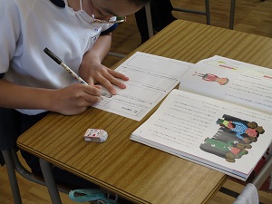 1年生の国語「じどう車ずかんをつくろう」の学習です。じどう車の「しごと」と「つくり」で表されている文に注目し、自分の経験からバスの「しごと」と「つくり」を書き込んでいく内容でした。難しい内容ですが、どの子もきちんとやることを理解し、バスの様々な「つくり」を見つけていました。見つけて書き込んだワークシートは、写真を撮りロイロノートで送ります。それを大きく映し出し、友達のいいところを見つけました。タブレットの操作も完璧です。学習の幅が大きく広がったのを感じました。1年1組さん、がんばりました!