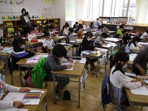 3年2組の音楽の授業の様子です。「ゆかいな木きん」を教材として、拍にのって打楽器を演奏するのがめあてです。使う楽器は、タンブリンとカスタネット。2つに分かれて演奏します。リズムが違う2つの楽器が混ざらないように自分の楽器の音を確かめながらたたきます。子供たちはとても上手で、演奏できていました。他にも旋律を階名で歌ったり、鍵盤ハーモニカで演奏したり…など、音楽を体いっぱいに楽しんでいました。