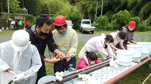 小雨の中でしたが、津金フィッシングランドでマス釣り体験をしました。釣った魚をさばき、命をいただきました。釣りも初めての体験という児童も多く最初は戸惑っていたようですが、友達同士で「頑張って!」「手伝うよ」と励まし合って貴重な体験をすることができました。途中からは雨も上がり明るくなりました。寂しいですが八ヶ岳移動教室も終わりに近づいています。