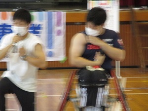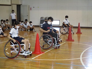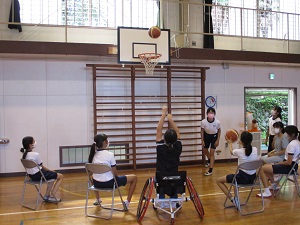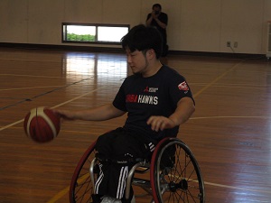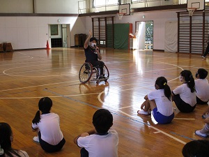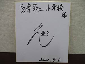 アスリート派遣事業が行われました。東京都の小中学校から50校しか選ばれない事業に、多摩第二小が見事選ばれたのです!今日、お越しいただいたアスリートの方は、川原 凜 選手です。車いすバスケットボール日本代表選手で、東京2020では、銀メダルを獲得しました。また、現日本代表のキャプテンを務めています。4~6年生を対象に行ったトークショーは、子供たちから出された質問に答える形式で行われました。車いすバスケットボールの魅力や練習について、日常生活のことまで、とても詳しく丁寧にお話ししてくださいました。印象的だったのは、日常生活で困っていることはないとのことでした。生まれつき脊髄に病気をもっていたため、小さいころから車いす生活なので、何とも思わないのだそうです。自分自身が普通に考えている当たり前にとらわれてはいけないことを改めて感じました。トークショーの中では、ファシリテーターを務めた醍醐先生と筋肉比べをする場面もありました。(写真がボケてしまいすみません。)モリモリの肩と腕の筋肉に、子供たちからは歓声が上がっていました。模範演技では、車いすの扱いやスピード、シュートのすばらしいこと!それを間近で見られた子供たちは幸せ者です。最後に子供たちへ向けて川原選手からメッセージをいただきました。「自分が好きなことを見つけて、それを楽しみながら努力をしていってほしい。ぜひ、夢中になれるものを見つけてください。」川原選手、ありがとうございました。実技体験は、6年生が行いました。競技用の車いす体験とシュート体験です。思うように動いてくれない車いすに苦戦したり、座ったままだと力が入らずゴールまでボールが届かなかったり、パラスポーツならではの体験ができました。最後に校長室では、銀メダルを間近で見せていただき、色紙をいただき、記念撮影を行いました。(私もツーショット写真をゲットしました!)サイン、分かりますか?「りん」と書かれています!!終わった後、すぐにお車で千葉県までお帰りになった川原選手。帰ってすぐに練習だそうです!本当にありがとうございました。ご活躍をお祈りしております!