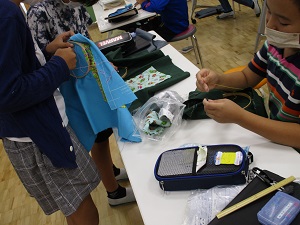6年生の家庭科の様子です。マイバックの製作中です。今日は、ほとんどの子が飾りの刺繡に取り組んでいました。細かい作業にぐったりしている子もチラホラ。でも、みんな根気よく作業していました。校長先生が見に来ていて、やり方を教わっている子もいました。製作中の作品を見ていると、どの子の作品も個性が出ていて素敵でした。完成が楽しみですね。