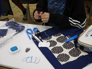 6年生の家庭科の様子です。マイバックの製作中です。今日は、ほとんどの子が飾りの刺繡に取り組んでいました。細かい作業にぐったりしている子もチラホラ。でも、みんな根気よく作業していました。校長先生が見に来ていて、やり方を教わっている子もいました。製作中の作品を見ていると、どの子の作品も個性が出ていて素敵でした。完成が楽しみですね。