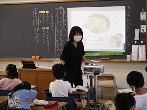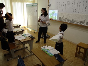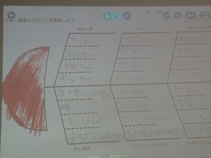 写真が少なくてすみません。にじ組1年生、国語「やくそく」の授業の様子です。カタカナの学習の後、全文を読み、あおむし達がした「やくそく」を読み取ります。いろいろな意見が出る中、家族や仲間を思いやる発言がたくさん出ました。みんな優しい!書けるようになった文字も増え、温かい雰囲気の中で楽しく学習し成長していることを実感できました。