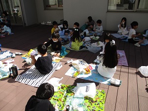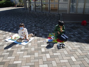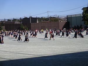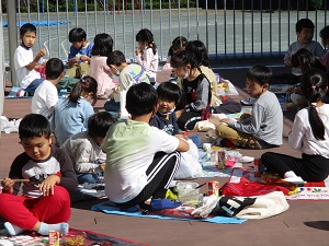 今日は久しぶりにすっきりと晴れわたり、秋の清々しい青空が広がりました。気温もちょうどよく(朝は寒かった!)、外での活動にはぴったりでした。写真の運動会練習は、前回に引き続き1年生。前回よりも大きく広がっています。踊りもしっかり覚えて動ける子がたくさんです。給食は、お楽しみの野外給食でした。1年生とにじ組1・2年生が、持ってきた入れ物に給食を詰め、外で給食を食べました。大勢の1年生は、2年生の教室外のテラスで食べました。気持ちのよい青空の下で食べると、いつもよりもおいしく感じます。みんなもりもりと食べていました。