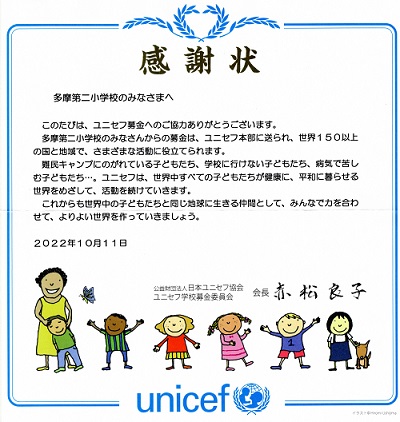 ユニセフよりユニセフ募金の感謝状が届きました。今年の募金総額は、41,925円。子供たちやご家庭の優しく温かい気持ちがとても嬉しいです。本当にありがとうございました。また、朝早くから募金準備に登校した代表委員の皆さん、ご苦労さまでした。皆さんの準備や役割のおかげです!