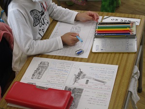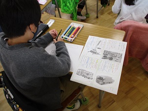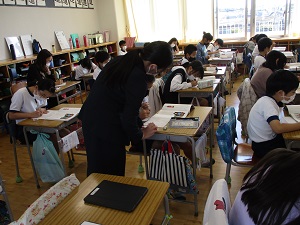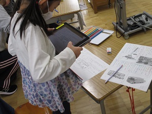 1年生の国語「じどう車ずかんをつくろう」の学習です。じどう車の「しごと」と「つくり」で表されている文に注目し、自分の経験からバスの「しごと」と「つくり」を書き込んでいく内容でした。難しい内容ですが、どの子もきちんとやることを理解し、バスの様々な「つくり」を見つけていました。見つけて書き込んだワークシートは、写真を撮りロイロノートで送ります。それを大きく映し出し、友達のいいところを見つけました。タブレットの操作も完璧です。学習の幅が大きく広がったのを感じました。1年1組さん、がんばりました!