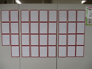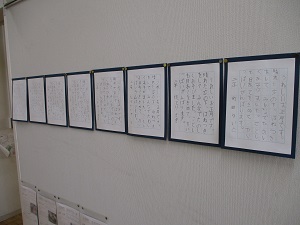 昨日に引き続き、校内書写展です。1・2年生と5・6年生の作品です。写真が小さくてすみません。(1・2年生のは文字が見えないですね…。)ぜひご家庭で掲示してください。よろしくお願いします。さあ、明日からは展覧会が始まります。保護者の皆様は、27日(金)の午後と28日(土)にご覧いただけます。体育館は冷えますので、暖かくしてお越しください。皆様のご来場をお待ちしております。
