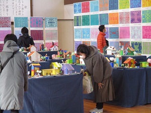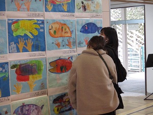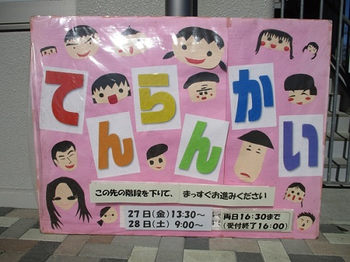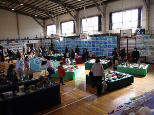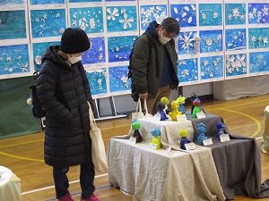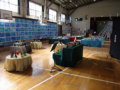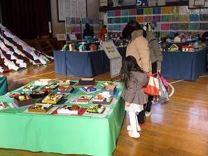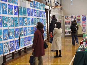 作品の展示、飾り付けなどの準備が終わり、今日から展覧会が始まりました。体育館いっぱいに作品が並ぶと圧巻です。じっくり見て回ると、努力の跡が見られるところやすてきな発想、思わず声をあげてしまうような作品がたくさんあります。早く保護者の皆様にも見ていただきたいです。(そう思って写真のサイズを大きくしました。)明日の午後1時30分からです。今日は昨日よりも暖かくなりましたが体育館は冷えますので、重ね着やカイロなどでご対応ください。スリッパ等と脱いだ靴を入れる袋を忘れないようお持ちください。