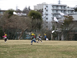 1年生が並木公園に凧あげに出かけました。とても冷たい風が吹いていたのですが、子供たちは寒さよりも凧をあげるのに一生懸命で、元気いっぱいに走り回っていました。凧に描いた子供たちの絵がかわいらしく、それが空高く上がっているのは、何ともいえずいいものです。ご家庭に持ち帰ったら、ぜひご家庭でもあげてみてください。写真を撮りに行った私は、からまる糸をほどくので大変でした!皆さんがあげるときは、隣とくっつかないように気を付けましょう。