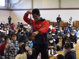 オリンピック・パラリンピック教育出張授業が行われました。1時間目は毎年お越しいただいている中田崇志さん。目の不自由な方の長距離走の伴走をされている方です。自身も大会に出場し、数々の賞やメダル、記録をもっている本物アスリートです。5年生を対象に走り方の実技指導を行っていただきました。冷たい風が吹いている校庭でしたが、腕の振り方を中心に学び、寒さが吹っ飛ぶほどたくさん走りました。5年生の子供たちは飲み込みが早く、中田さんからもたくさんお褒めの言葉をいただきました。2時間目は、4~6年生対象の講演会。ここではビックゲストに合流していただきました。お越しいただいたのは、高橋勇市さん。アテネパラリンピックのマラソンで金メダルをとったメダリストです。その時の伴走者は中田さんです。このお二人での講演会が実現できるなんて夢のようです。高橋さんはアテネでとった金メダルを持ってきてくださり、中田さんが持って子供たちの間を回ってくださりました。講演会では、パラリンピックのこと、視覚障害のこと、白杖のこと、現在も挑戦を続けていることなどを話されました。今回の出張授業を通して、子供たちにはあきらめない挑戦し続ける気持ちをもってほしいと願っています。