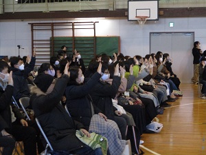 3年生の学習の様子です。画面に映しながら発表しているのは、「わたしのお気に入り」です。とても上手に発表していました。作品から文章を作成し発表するという流れを経験し、積み重ねるのはとても大切です。皆さん、よくがんばりました。次は音楽のリーコーダー練習です。3年生で初めて取り組むリコーダーですが、とても優しく柔らかい音で吹けていました。練習あるのみ!がんばれ3年生。最後は、6年生を送る会の練習で体育館に集まったところです。練習の風景を写真に撮りたかったのですが、呼ばれてしまって集まったところだけになってしまいました。3学期の残りは20日と少し。お世話になった6年生に感謝の気持ちを伝えられるといいですね。発表練習、がんばってほしいです。