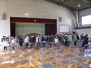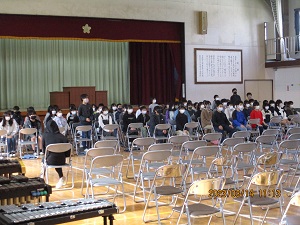 今日はとても暖かくなり、今週はしばらく暖かい日が続くようです。例年になく暖かくなる日が多いため、狂い咲きする桜もちらほら出ているようです。また、桜の開花が早まり、卒業式の時に満開になんてことがあるかもしれません。暖かい空気に包まれて、外遊びや体育は、とても気持ちよさそうでした。元気いっぱいに体を動かし、これまでの寒さで縮こまった体をぐーっと伸ばしてほしいと思います。体育館に集合しているのは、6年生。いよいよ今日から卒業式練習が始まりました。卒業式へ向けての心構えや細かいことを、これからじっくり練習していきます。6年生の子供たちは、真剣な顔付きで話を聞き、背筋をピッと伸ばして練習していました。緊張感があり、とても立派な態度でした。