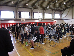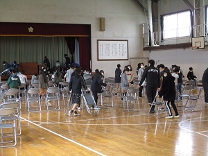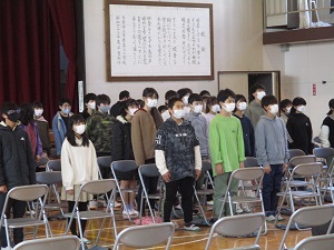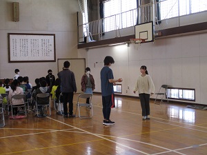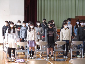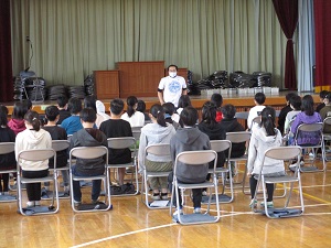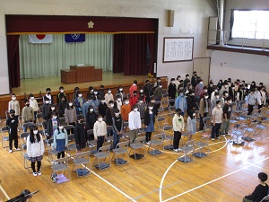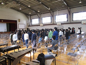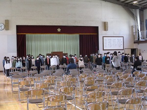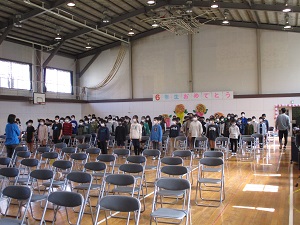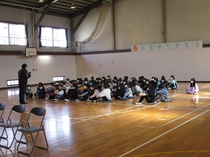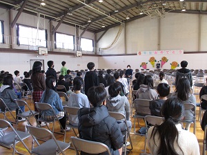 今日はとても暖かくなり、今週はしばらく暖かい日が続くようです。例年になく暖かくなる日が多いため、狂い咲きする桜もちらほら出ているようです。また、桜の開花が早まり、卒業式の時に満開になんてことがあるかもしれません。暖かい空気に包まれて、外遊びや体育は、とても気持ちよさそうでした。元気いっぱいに体を動かし、これまでの寒さで縮こまった体をぐーっと伸ばしてほしいと思います。体育館に集合しているのは、6年生。いよいよ今日から卒業式練習が始まりました。卒業式へ向けての心構えや細かいことを、これからじっくり練習していきます。6年生の子供たちは、真剣な顔付きで話を聞き、背筋をピッと伸ばして練習していました。緊張感があり、とても立派な態度でした。
