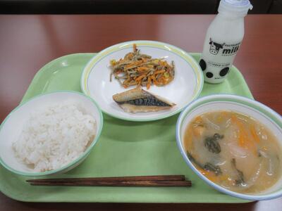 給食 ごはん たまねぎのみそ汁 さばの塩焼き のりマヨ炒め 牛乳 でした。