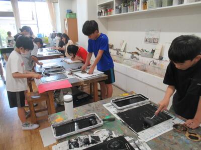 6年生 図工 名前をデザインした型を使って、仕上げ(版画)をしました。すてきな作品が次々とうまれました。