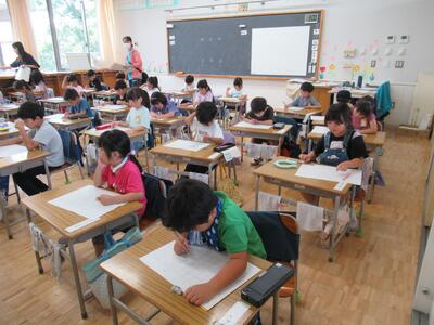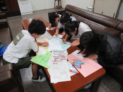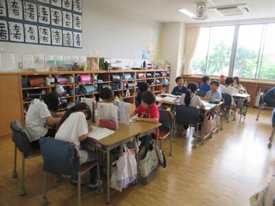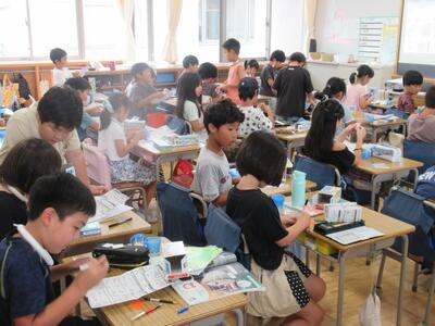 放課後子ども教室 涼しい部屋で楽しそうにおしゃべりもしながら描いていました。次回は10月です。お楽しみに!