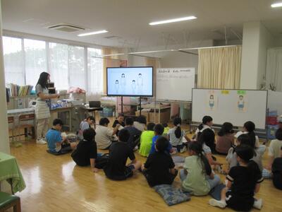 にじ組 3年生ではクイズ大会をしていました。出題者が順番に前に出て問題を言うと、みんなが答えを考えていました。