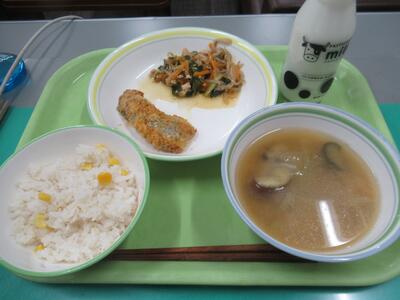 給食 ごはん たまねぎのみそ汁 さばの塩焼き のりマヨ炒め 牛乳 でした。