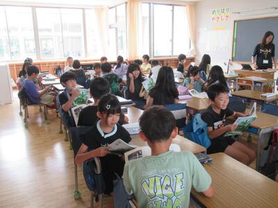 5年生 外国語科 本日もALTとマンツーマンで会話をするアクティビティを行いました。終わった人はワークシートにシールを貼っていました。