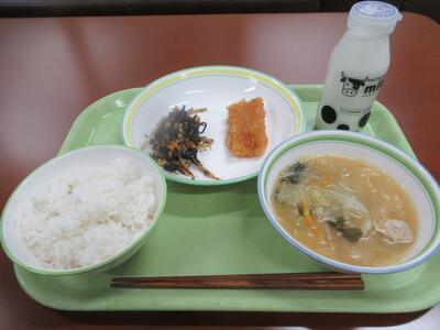 給食 ごはん 具だくさんみそ汁 いかのカリン揚げ ひじきの煮物 牛乳 でした。