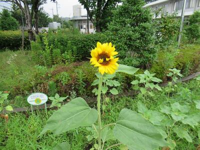 ひまわりプロジェクト クラスごとに願いを添えて植えたひまわりの第1号が咲きました。6年生のひまわりです。これからどんどん咲きそうです。次は何年生のひまわりかな?