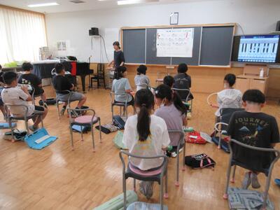 5年生 音楽 合奏の基本になるメロディを鍵盤ハーモニカで練習しました。難しい部分もありますが、繰り返し練習し、上達を目指します。鍵盤系の楽器を希望する人は夏休みの宿題にもなっています。