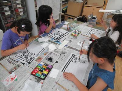 放課後子ども教室 今年度初めての「絵手紙教室」でした。筆を立てて使う練習をしてから、「夏」をテーマにした作品を画仙紙に描きました。