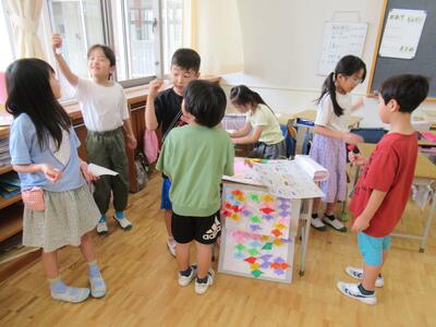 2年生 学級活動 夏祭りをしました。折り紙屋さん、盆踊り屋さん、輪投げ屋さん、ボール投げ屋さん、くじ引き屋さんと盛りだくさんでした。