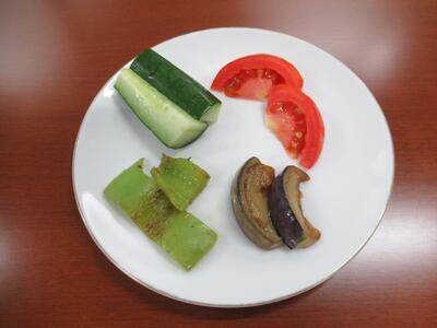 給食 とうもろこしごはん 夏野菜のスタミナ汁 めだいのカレー焼き にらともらしの炒め物 牛乳 でした。