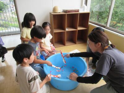 2年生 学級活動 夏祭りでは屋台があり、「チョコバナナ」や「かき氷」などが並んでいました。景品は「3色めがね」や「ミニヨーヨー」など工夫した物が並び、豊かな経験がこのような場でも活かされているのが分かります。