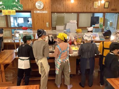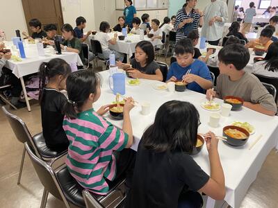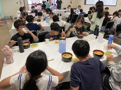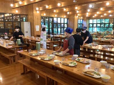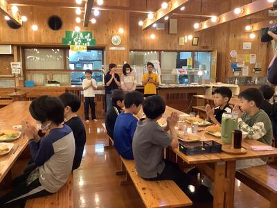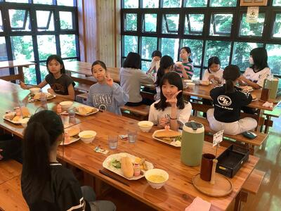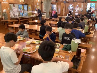 5年生 朝食です。食事係が今朝も配膳をしてくれました。食堂の方から、「こんなに素早く配膳をした学校はありませんでした。新記録です!」と褒められました。昨晩、睡眠をしっかりとった人は朝食を完食していました。