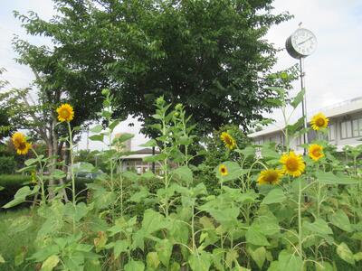 正門近くの花壇にはひまわりが咲いています。ひまわりが子どもたちを出迎えました。