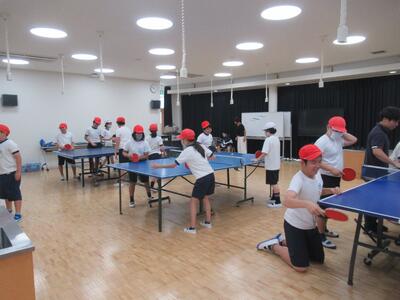 にじ組 涼しい多目的ホールで卓球をしました。ペアで玉を転がすラリーを楽しみました。