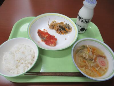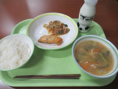 給食 ごはん、五目スープ、白身魚のチリソース、にらともやしの炒め物、牛乳 でした。