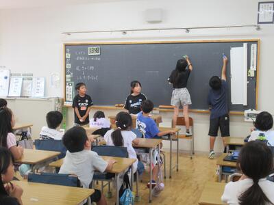 前期終業式 3年生と4年生の代表児童が前期の振り返りについて発表しました。