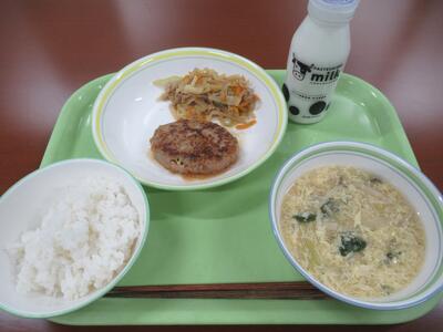 給食 ごはん、きのこのかきたま汁、和風ハンバーグ、千切り野菜の炒め物、牛乳 でした。