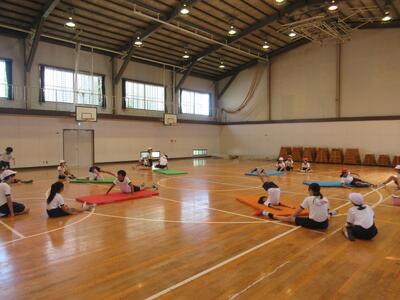 5年生 マット運動では後転や開脚後転の練習をしていました。
