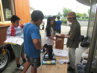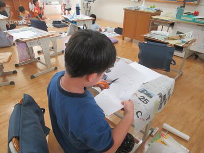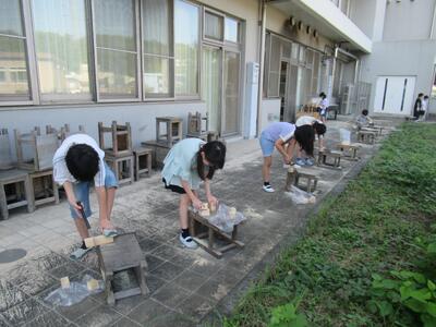 3年生 図工ではのこぎりを使って木を切っていました。汗だくでした。